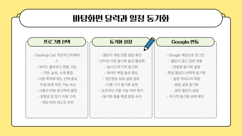 바탕화면 달력과 일정 동기화는 업무와 생활에서 효율성을 크게 높일 수 있는 도구입니다. 다양한 소프트웨어와 기능을 활용하여 자신의 필요에 맞게 설정해 보세요. 특히, 일정 동기화를 꾸준히 실천하면 중요한 일정을 놓치지 않고 더 편리한 일상을 만들 수 있습니다.